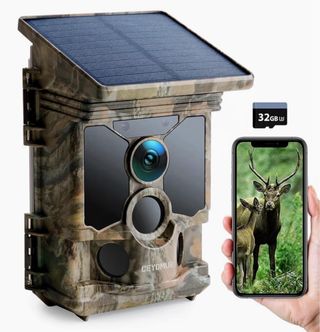 Cámara de caza Ceyomur CY95 con panel solar integrado y conectividad WiFi. - Resolución de 68MP y grabación de video 4K a 30fps. - Tarjeta de 32gb incluida. - Panel solar para alimentación continua. - Conectividad WiFi para acceso remoto. - Diseño camuflado. - Incluye correa y soporte.
