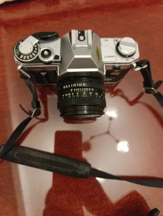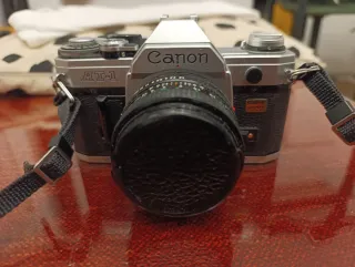 Cámara de fotos analógica Canon AT-1. - Cuerpo plateado y negro. - Correa de sujeción incluida.