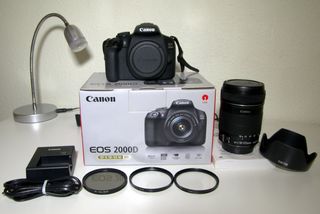 Canon EOS 2000D en perfectas condiciones. Como nueva. Comprada con el kit que tenía el objetivo EF-S 18-55mm III. Cambié ese objetivo por el EF-S 18-135mm IS (con estabilizador) para acercar más. CANON EOS 2000D con sensor de 24.1 MP, Wi-Fi y NFC. Viene con tapa de cuerpo, tapa de protección de la zapata del flash externo, correa, batería, cargador, y tarjeta SD de 16 GB que venía en el kit. Objetivo CANON ZOOM LENS EF-S 18-135mm 1:3.5-5.6 IS con parasol EW-73B y tapas delantera y trasera. Filtro UV de protección del objetivo. Filtro estrella para puntos de luz. Filtro polarizador PCL Todo original y perfecto.