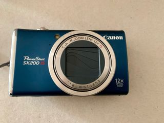 Cámara digital Canon PowerShot SX200 IS en color azul y plateado. Compacta y fácil de usar. Tiene marcas de uso como se aprecia en las fotos - Zoom óptico 12x. - Lente Canon 6mm 1:3.4-5.3. - Pantalla LCD de 3 pulgadas. - Grabación de vídeo HD. - Cargador Bateria - Bateria NB-5L - Tarjeta 4GB - Funda protectora - Caja original
