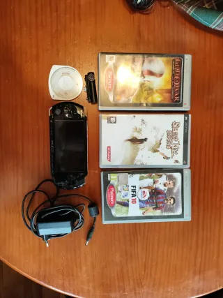 Consola portátil PSP 3004 en color negro, con cámara y cargador. Incluye los siguientes juegos: - God of War: Chains of Olympus - Silent Hill: Origins - FIFA 10 - FIFA 08