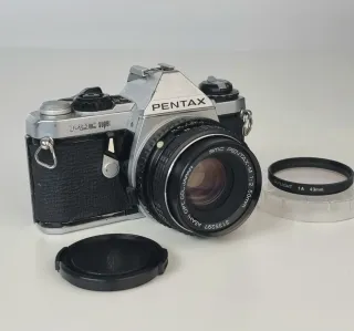 Cámara réflex analógica de carrete de 35 mm PENTAX ME SÚPER, con objetivo PENTAX M de 50mm F1.2 (luminoso, limpio, sin marcas). Es una de las mejores cámaras de PENTAX. Muy valorada, compacta, ligera y con una calidad óptica excelente. Puedes ver reviews excepcionales en internet. Cuerpo robusto, mecánico y fiable. Totalmente operativa, incluído autodisparador y exposímetro. Visor claro (foto 10). Perfecta como REGALO para iniciarse en fotografía analógica Incluye tapa del objetivo, filtro Skylight y pilas nuevas. Las fotografías forman parte de la descripción. Hago envíos por Wallapop o entrega en mano en Valencia