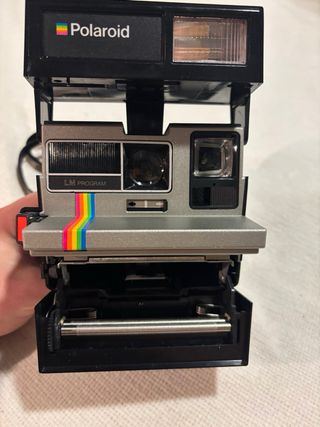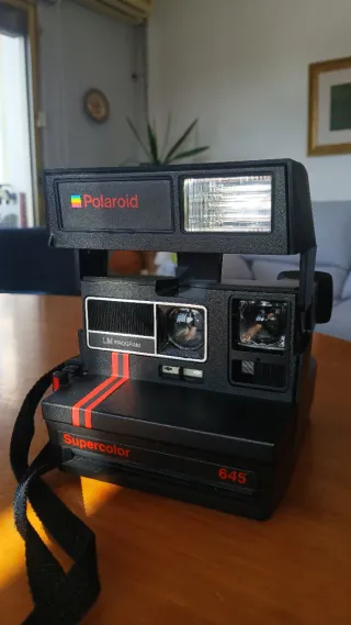 Cámara instantánea Polaroid Supercolor 645 en color negro y rojo. Un clásico para capturar momentos. - Modelo Supercolor 645. - Diseño icónico de Polaroid. Mecánicamente comprobada: El motor arrastra correctamente y el flash carga y dispara. Probada con cartucho con batería (ciclo completo de carga y expulsión). No se ha revelado película recientemente, pero el obturador y las lentes están limpios