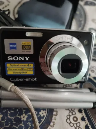 Cámara digital Sony Cyber-shot con lente Carl Zeiss Vario-Tessar, con cargador. - Grabación Full HD 1080. - Zoom óptico 4x. - Lente gran angular de 30mm. - Estabilizador SteadyShot. - Incluye trípode de aluminio, bateria, 2 tarjetas de memoria y estuche acolchado.
