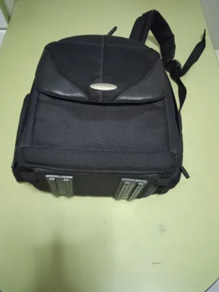Mochila negra diseñada para transportar equipo fotográfico. Cuenta con correas ajustables para mayor comodidad. - Compartimentos acolchados para proteger la cámara y accesorios. - Bolsillos exteriores para objetos pequeños. - Material resistente y duradero.