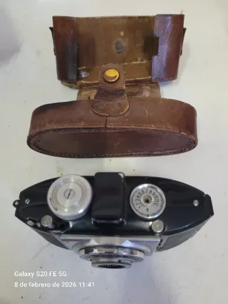 Cámara fotográfica Fowell Cinefilm 35 A. - Color negro y detalles en marrón. - Incluye funda de cuero. La cámara de la imagen es una Fowell Cinefilm 35 A, una cámara de baquelita para película de 35 mm fabricada en España entre 1949 y 1955. Es una versión, casi idéntica, de la cámara estadounidense Spartus 35F. Cuenta con un objetivo acromático fijo f/7.7 con una distancia focal de 50 mm. Tiene una única velocidad de obturación y ajustes de apertura limitados a "INST" (instantánea) y "TIEMPO" (tiempo de exposición).