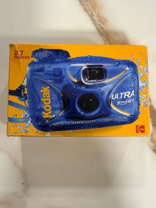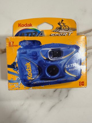 Cámara analógica Kodak Ultra Sport, ideal para aventuras. Es sumergible hasta 10 metros. - Incluye 27 fotos. - Color azul vibrante. - Diseño resistente al agua.