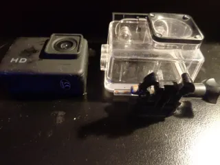 Cámara de acción HD junto con su carcasa impermeable y varios accesorios. -Diseño compacto y ligero, típico de las cámaras deportivas. - Incluye una carcasa impermeable transparente para protección y uso bajo el agua. - Se utiliza para capturar videos y fotos durante actividades al aire libre o deportes. - La carcasa cuenta con un soporte de montaje estándar para diversos accesorios - Soporte para cámara. - Cable de carga USB.