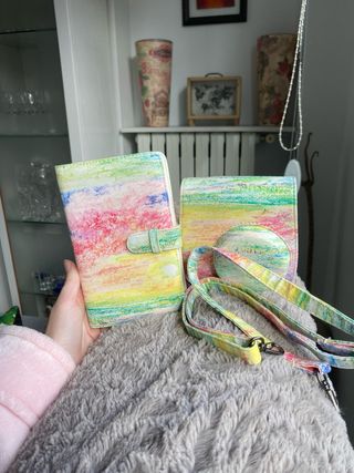 Set de funda y álbum para cámara Instax Mini 9 con un diseño colorido y artístico. - Funda protectora con cierre. - Álbum para guardar tus fotos.