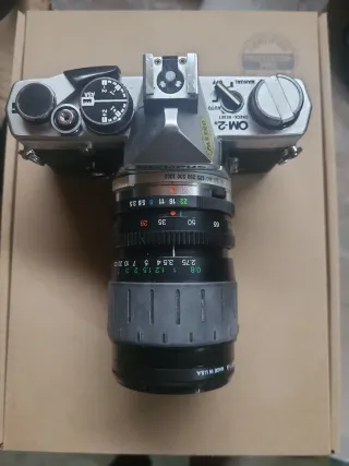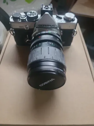 Cámara analógica Olympus OM-2 en color plata y negro. Un clásico para los amantes de la fotografía. Varios objetivos, flash, bolsa de transporte de cuero. Muy buenas condiciones. Venta en mano