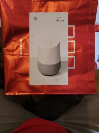 Altavoz inteligente Google Home de 1 generación en color gris y blanco. Un dispositivo compacto y elegante para tu hogar. - Diseño cilíndrico. - Parte superior con controles táctiles.