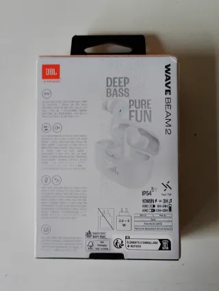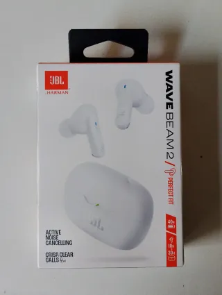 Auriculares inalámbricos JBL Wave Beam 2 en color blanco. - Cancelación activa de ruido. - Llamadas nítidas y claras. - Ajuste perfecto. - Hasta 40 horas de autonomía total.