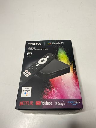 Reproductor multimedia STRONG LEAP-S3 con Google TV. - Soporta resolución 4K UHD. - Incluye mando a distancia. - Compatible con Netflix, YouTube, Disney+ y Prime Video.