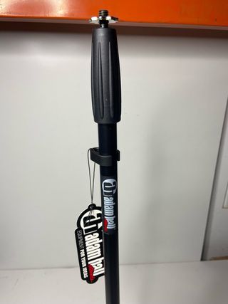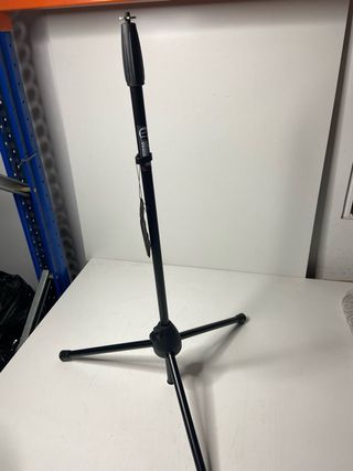 Trípode de la marca Adam Hall. Es un soporte negro con patas plegables. - Base estable con tres patas. - Ajustable en altura. - Conector universal en la parte superior.