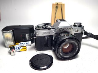 Canon AE-1 con objetivo 50mm f/1.8 y flash
