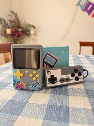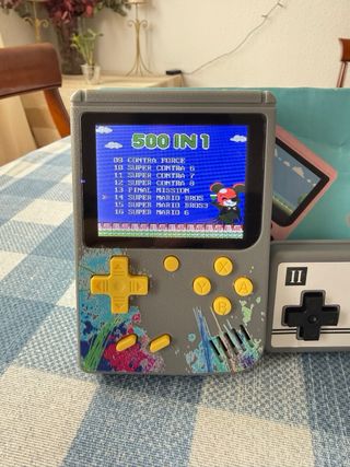 Incluye 500 juegos retro clásicos integrados, ofreciendo horas de diversión en una pantalla a color de 3 pulgadas. Lo mejor de este pack es que incluye el mando adicional para disfrutar de partidas en modo 2 jugadores y también es posible conectarla directamente a tu televisor y jugar a lo grande. Es totalmente portátil gracias a su batería recargable (incluida). El artículo ha tenido muy poco uso, funciona perfectamente y se entrega con su caja original, siendo el regalo ideal o un capricho perfecto para cualquier amante de lo retro. ¡Envío rápido y bien protegido!