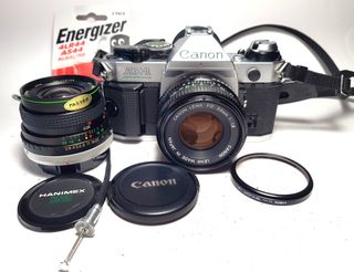 Cámara réflex Canon A-1 revisada y probada ,visor limpio ,exposimetro funtiona bien ,sellos de luz nuevos, con lente Canon FD 50mm f/1.8 en excelente condiciones . - Cuerpo de cámara en color negro. - Lente con apertura 1:1.8. - Incluye tapa de lente Canon . - Correa camara Cnon 50D nueva . - Empuñadura camara . - Pila alcalina de 6 voltios Energizer ,nueva .