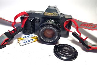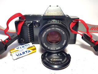Cámara réflex Canon T70 revisada ,probada ,functiona bien en todos modos ,visor limpio ,exposimetro funtiona bien ,con objetivo Canon FD 50mm 1:1.8. - Cuerpo de cámara en color negro. - Objetivo Canon FD 50mm 1:1.8 en buenas condiciones ,sin polvo grasa o hongos . - Incluye tapa de objetivo conmemorativa de los Juegos Olímpicos de 1984. - Incluye parasolar visor Canon . - Correa original ,suya ,Canon - Incluye dos pilas Varta Alkaline.