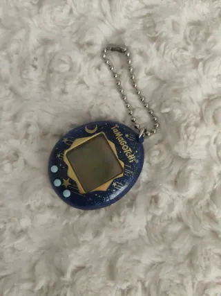 Tamagotchi con un diseño azul salpicado de estrellas y lunas doradas. Incluye una cadena para llevarlo como llavero. - Diseño temático de noche estrellada. - Cadena metálica para llavero. - Manual de instrucciones con rotura -Hay que sustituir las pilas