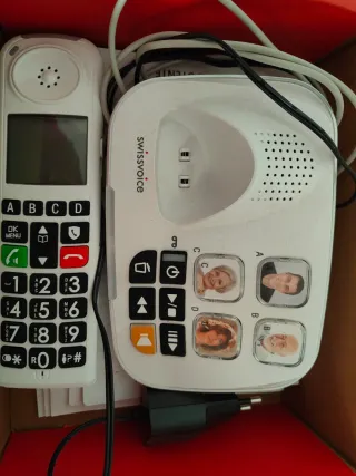 Teléfono inalámbrico Swissvoice Xtra 2355, diseñado para facilitar la comunicación. - Base con 4 teclas de marcación rápida con fotos. - Pantalla LCD con números grandes. - Teclado con botones de gran tamaño. - Incluye manual de usuario.