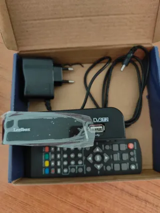 Receptor TDT Leelbox con conexión DVB-T2. Incluye mando a distancia y adaptador de corriente. - Receptor TDT DVB-T2. - Mando a distancia. - Adaptador de corriente.
