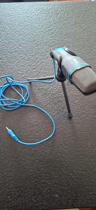 Micrófono compacto con soporte de trípode y cable de conexión. - Diseño moderno en gris y azul. - Cable de conexión de color azul brillante. - Trípode plegable para fácil transporte.