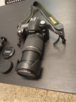Se vende cámara réflex Nikon D90 junto con un objetivo Tamron y accesorios. - Cuerpo de cámara Nikon D90. - Objetivo Tamron. - Tapa de objetivo. - Parasol. - Correa para el cuello.