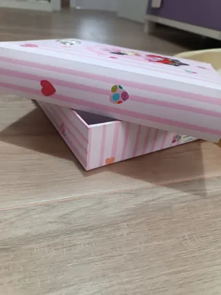 Álbum de fotos con un diseño encantador de Minnie Mouse y detalles de corazones. - Portada con rayas rosas y blancas. - Ilustración de Minnie Mouse en un carrito. - Adornos de corazones de plata en la portada del álbum. - Separadores de papel vegetal para proteger las fotos. - Lleva caja,y papel con el mismo dibujo del álbum para guardar.