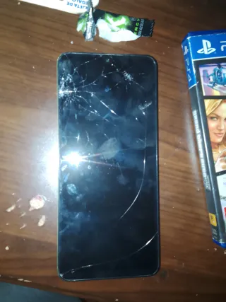 Teléfono móvil en color negro. La pantalla presenta roturas. - Pantalla con grietas visibles. - Marco del teléfono. El móvil está roto pantalla rota pero por lo demás bien