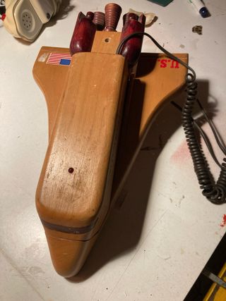Teléfono antiguo con un diseño único en madera. - Acabado en tonos marrones y detalles en rojo. - Incluye cable en espiral.