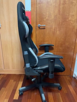 Sillón ergonómico de estilo gaming, diseñado para largas sesiones. - Tapicería en tela negra y gris. - Incluye cojín lumbar y reposacabezas. - Base de 5 ruedas para fácil movilidad. Solo tiene un pequeña marca en el cojin lumbar del uso, ver sexta foto, por lo demas perfecto.
