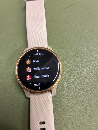 Reloj inteligente Garmin Venu con correa beige y detalles dorados. Incluye cable de carga. - Esfera redonda. - Correa con múltiples ajustes. - Bisel metálico. La pantalla tiene algunos signos de uso, pero está en buen estado y la bateria está perfecta. No tiene caja. Se entrega reloj y cargador original Garmin.