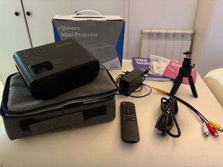 No hago envíos. Recogida en Cardedeu o Sant Celoni. Mini proyector ELEPHAS en color negro y gris. Incluye accesorios para su uso. - Funda de transporte. - Mando a distancia. - Cable de alimentación. - Trípode pequeño. - Cables de conexión AV.
