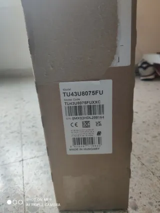 Televisor Samsung modelo TU43U8075FU de 43 pulgadas. Fabricado en Hungría. - Modelo: TU43U8075FU - Código de modelo: TU43U8075FUXXC - Número de serie: 0MX93HDL200164