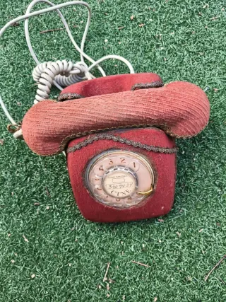 Teléfono antiguo con un diseño único y llamativo, cubierto de terciopelo. - Acabado en terciopelo de color rojo. - Detalles de pasamanería dorada. - Marcación giratoria. - Cable en espiral.