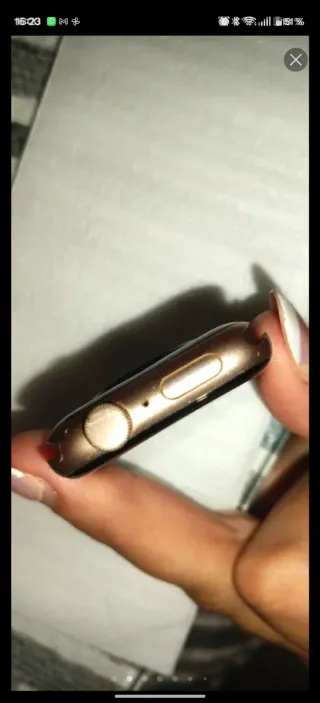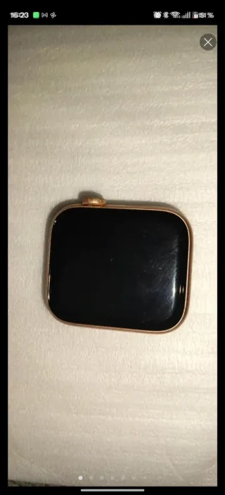 Reloj inteligente Apple Watch SE con acabado en oro y pantalla negra. - Diseño elegante y moderno. - Esfera de color negro. - Caja de color oro.