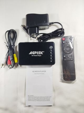 Reproductor multimedia AGPTEK en color negro, con capacidad para 14TB HDD y unidad USB de 256GB. - Soporta resoluciones 4K a 30Hz. - Salidas de video HDMI, AV y VGA. - Compatible con formatos H.265, MP4, MP3, AVI, RMVB y MPEG. - Incluye control remoto.