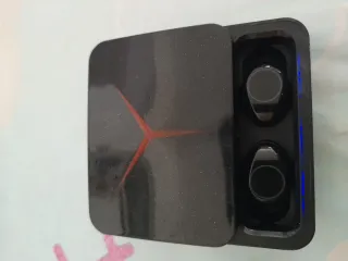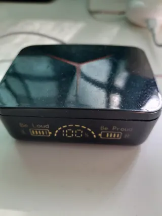 Auriculares tipo earbuds en acabado negro. - Diseño moderno con detalles en rojo. - Indicador de batería digital. - Mensajes inspiradores grabados: Be Loud y Be Proud.