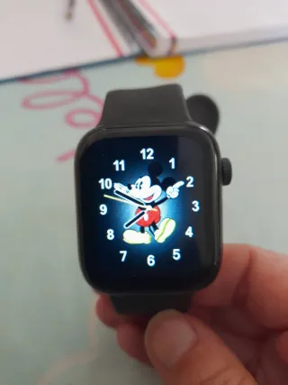 Reloj inteligente con un diseño moderno y divertido. - Pantalla a color. - Correa negra. - Esfera con personaje de Mickey Mouse.
