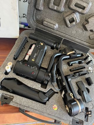 Estabilizador Zhiyun Crane 3S Pro en su maletín. - Incluye todos los accesorios originales. - Maletín de transporte con compartimentos. - Diseño robusto y profesional. -Carga de hasta 6,5Kg -Baterías extra -Accesorios nuevos sin usar como el transmisor y motores todavía embalados. -Muy mimado