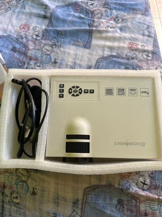 Proyector de la marca Excelvan en color blanco. INCLUYO SOPORTE PARA TECHO - Diseño compacto y moderno. - Panel de control superior con botones de navegación. - Lente frontal para enfoque. - Salida de aire en la parte trasera.