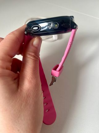 Reloj inteligente diseñado para niños, con una correa de silicona en color rosa vibrante y detalles en negro. Ideal para tu hij@ antes de tener móvil . Puedes meter una tarjeta sim y hablar en cualquier momento, además de saber su ubicación. - Correa de silicona con diseño. - Hebilla metálica para ajuste. - Cable de carga incluido.
