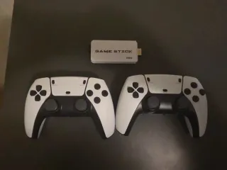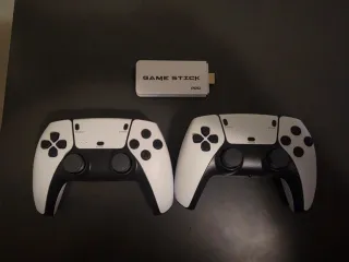 Consola de videojuegos GAME STICK PRO con dos mandos. - Diseño moderno en blanco y negro. - Incluye dos mandos para jugar. - Compacta y fácil de conectar.