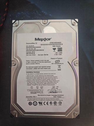 Disco duro Maxtor DiamondMax 22 con capacidad de 1TB. - Modelo: STM31000340AS - S/N: BOJ26H20 - P/N: OCT 158-325 - Firmware: MX15 - Código de fecha: 09124 - Fabricado en Tailandia.