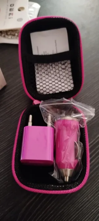 Set de cargador de movilpara coche y adaptador de enchufe de pared en color rosa. - Cargador de coche con diseño cilíndrico. - Adaptador de enchufe de pared cuadrado. - Incluye funda protectora con cremallera.