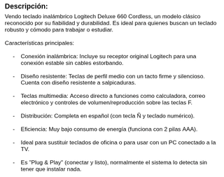 Vendo teclado inalámbrico Logitech Deluxe 660 Cordless, un modelo clásico reconocido por su fiabilidad y durabilidad. Es ideal para quienes buscan un teclado robusto y cómodo para trabajar o estudiar. - Diseño elegante en color negro. - Incluye receptor USB. MÁS DETALLES EN LA SEGUNDA IMAGEN