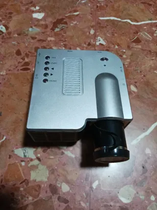 Mini proyector con un diseño compacto y moderno. - Puertos: HDMI, VGA, AV, SD. - Botones de control: Power, ESC, INPUT, ENTER. - Entrada de corriente DC-IN. - Salida de audio.