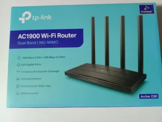 Router TP-Link Archer C80 con tecnología Wi-Fi AC1900 Dual Band. - Velocidades de hasta 1900 Mbps. - MU-MIMO para múltiples dispositivos. - Airtime Fairness para optimizar el tiempo de red. - Smart Connect para la mejor banda Wi-Fi. - Cuatro antenas omnidireccionales para amplia cobertura. - Puertos Gigabit Ethernet para conexiones rápidas.