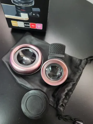 Kit de lentes clip-on para teléfonos móviles. Incluye lente gran angular y macro. - Lente 0.45X Super Wide Angle. - Lente Macro. - Clip de sujeción. - Bolsa de transporte.