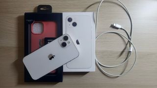 iPhone 13 Blanco con Funda de Blue Banana y Cable
